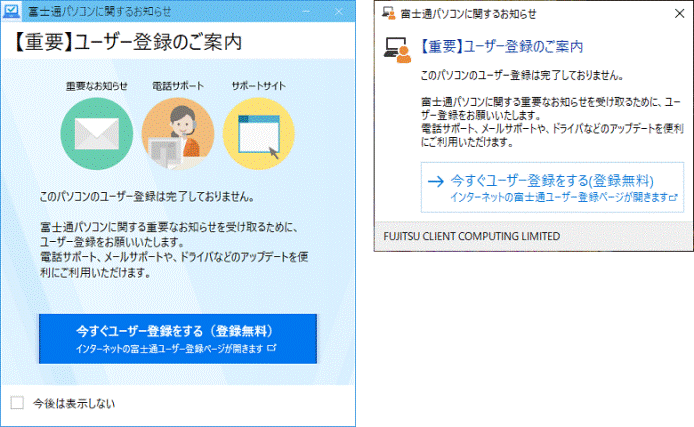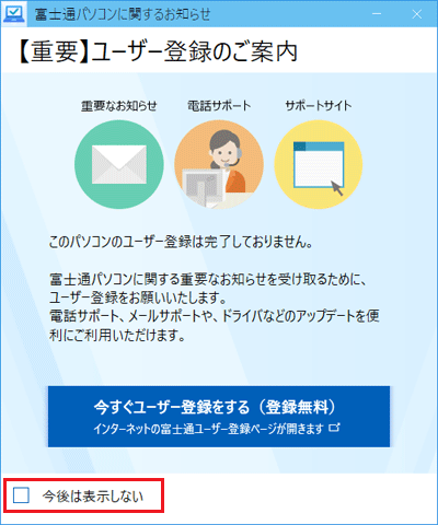 「富士通パソコンに関するお知らせ」、「【重要】ユーザー登録のご案内」は、お使いの機種のユーザー登録が完了していない場合に表示されます。