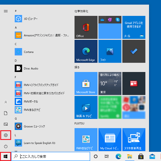 - 「スタート」ボタン→「設定」の順にクリックします。