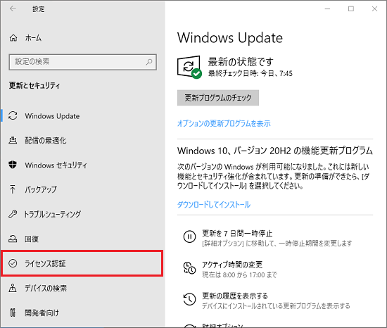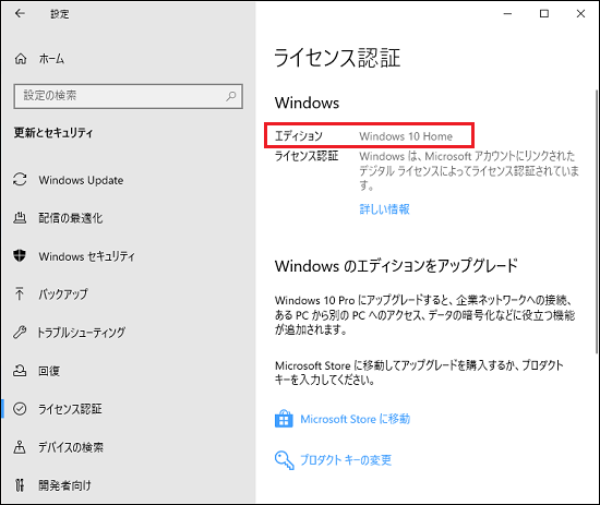 - 「ライセンス認証」の「Windows」の「エディション」が「Windows 10 Home」になったことを確認します。