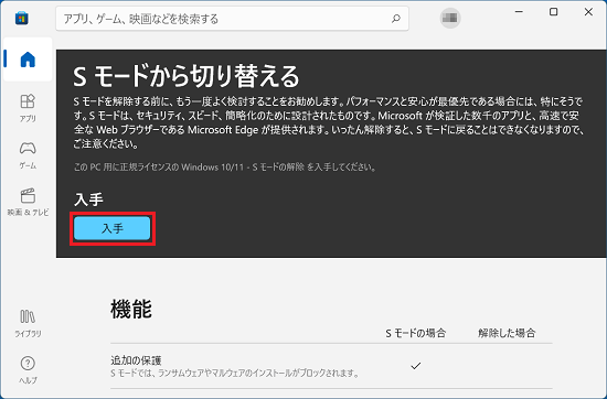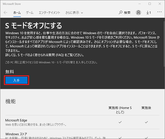 「S モードから切り替える」の「入手」ボタンをクリックします。