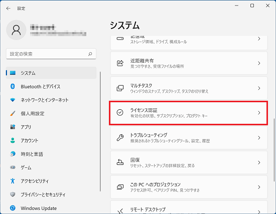 」(ナビゲーションを開く)→「システム」の順にクリックします。 - 画面右側の一覧をスクロールして、「ライセンス認証」をクリックします。