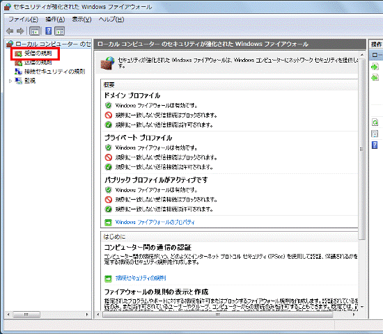 - 画面の中央に「ローカル コンピューター のセキュリティが強化された Windows ファイアウォール」と表示されます。