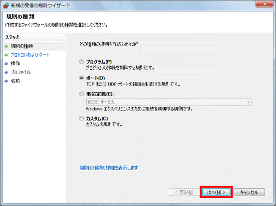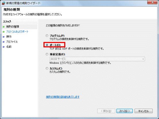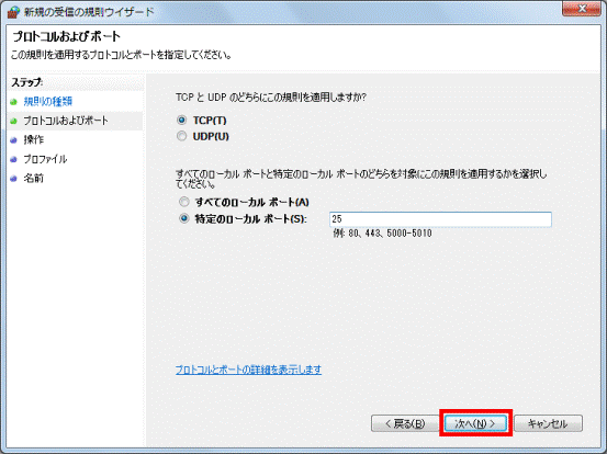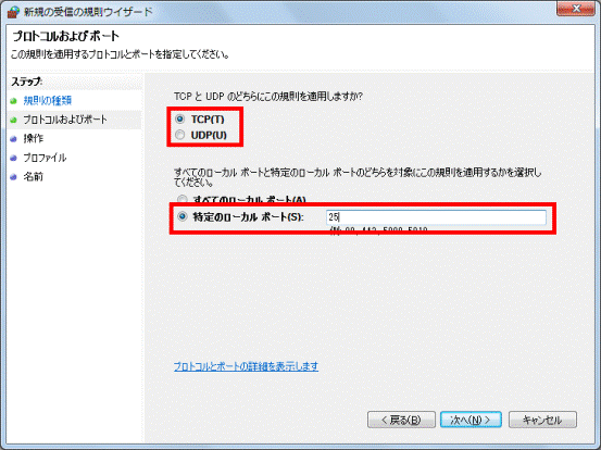 ポート番号にあわせて、TCPかUDPのどちらかをクリックします。 - ポートの指定