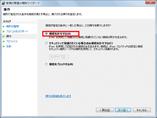 ポートを閉じたい場合は、「接続をブロックする」をクリックします。 - 「次へ」ボタンをクリックします。