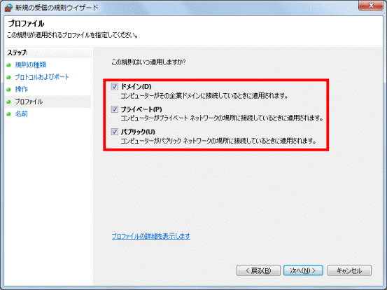 「ドメイン」、「プライベート」、「パブリック」の項目のうち、適用しない項目のチェックを外します。