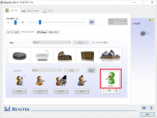 「スピーカー」タブにある「サウンドエフェクト」タブをクリックします。