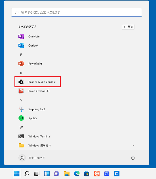 「スタート」ボタンをクリックし、すべてのアプリの一覧から「Realtek Audio Console」をクリックします。