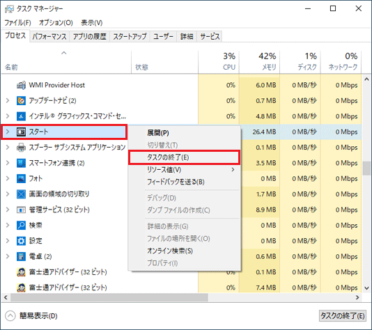 「スタート」のプロセスを再起動し、改善しない場合はパソコンを再起動します。