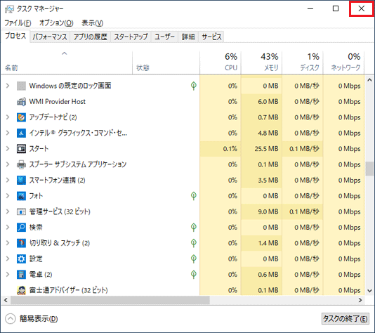 「プロセス」の表示が無い場合は、画面下の「詳細」をクリックしてください。