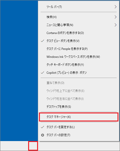 タスクバーの何もないところをクリックしても「タスクマネージャー」が表示されない場合は、次のいずれかの操作を行ってください。