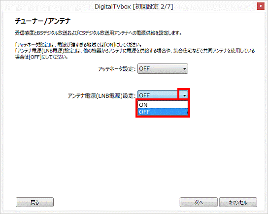 - 「アンテナ電源(LNB電源)設定」欄の「▼」ボタンをクリックし、表示されるメニューから「ON」または「OFF」をクリックします。