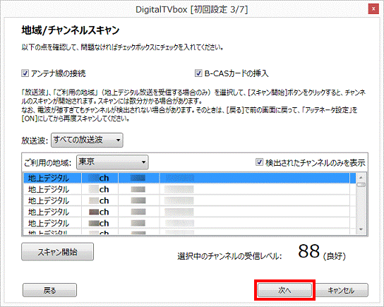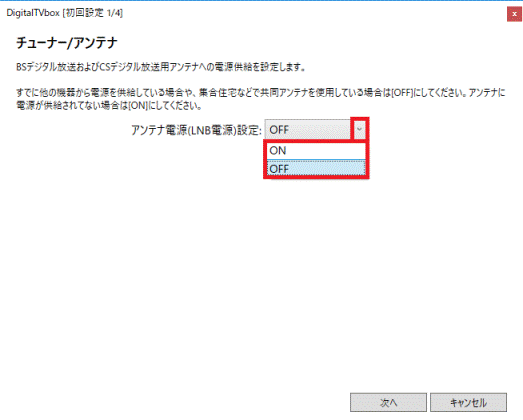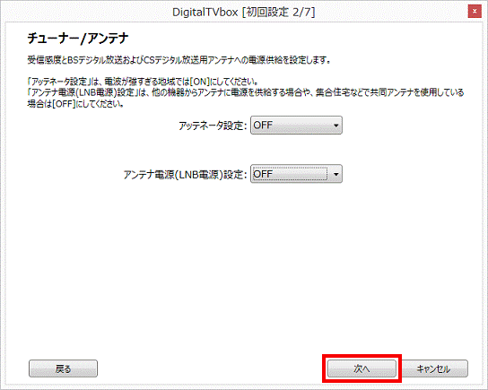 BS・110度CSデジタル放送用アンテナへの電源供給が必要かどうかを教えてださい。 - 「次へ」ボタンをクリックします。