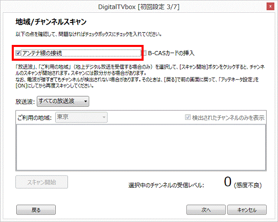 「アンテナ線の接続」または「アンテナ線との接続を確認してください。」をクリックし、チェックを付けます。