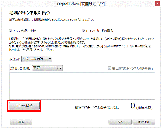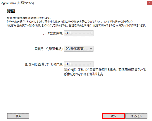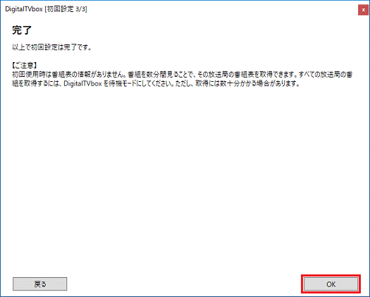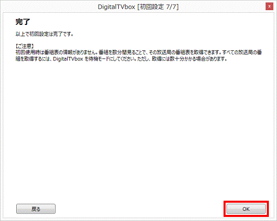 DigitalTVboxを初めて起動した場合に表示される、初回設定用の画面で設定します。