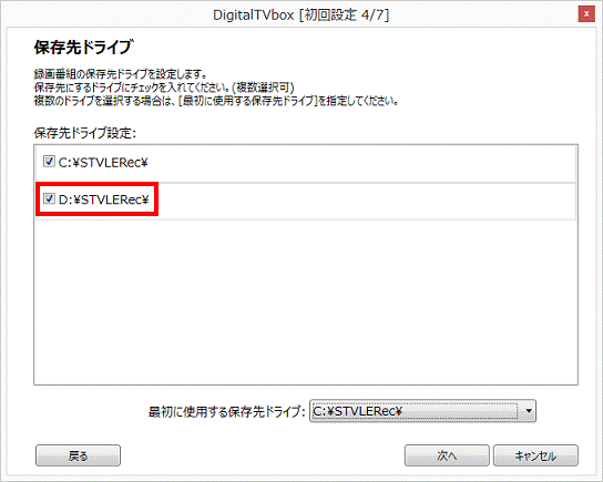 「保存先ドライブ設定」欄の、「D:¥STVLERec¥」にチェックがあることを確認します。