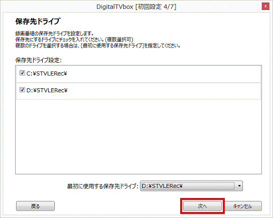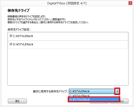 - 「最初に使用する保存先ドライブ」欄の「▼」ボタンをクリックし、表示されるメニューから「D:¥STVLERec¥」をクリックします。