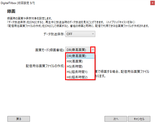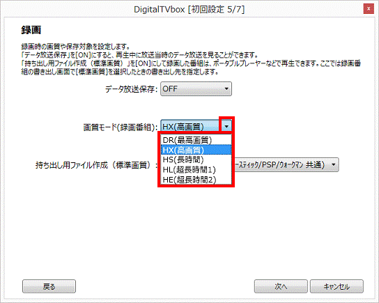 - 「画質モード」欄の「▼」ボタンをクリックし、表示されるメニューから、番組を録画するときの画質をクリックします。