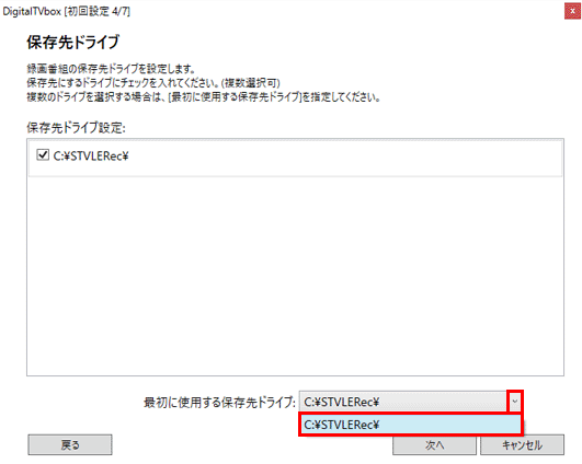 - 「最初に使用する保存先ドライブ」欄の「▼」ボタンをクリックし、表示されるメニューから「C:¥STVLERec¥」をクリックします。