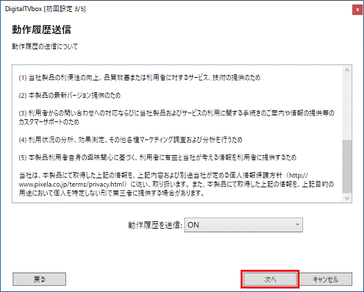 内容をよく読み、お好みに応じて「動作履歴を送信」欄の「▼」ボタンをクリックし「ON」または「OFF」をクリックします。