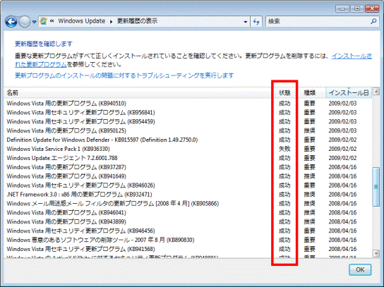 「更新プログラムのインストールに失敗している場合の対処方法」へ進みます。 - 「状態」の項目に「失敗」が表示されていない場合