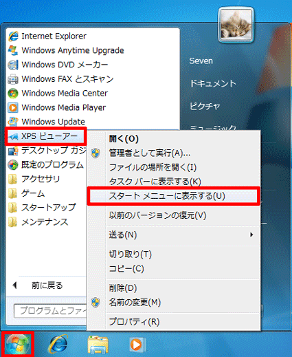 [Windows 7] スタートメニューに特定のアプリケーションを常に表示する方法を教えてください。