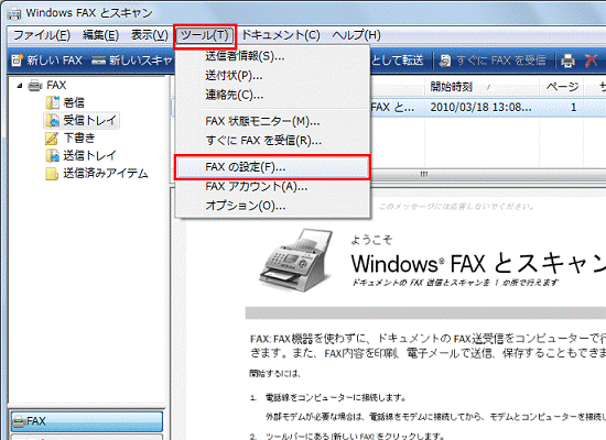 「ツール」メニュー→「FAXの設定」の順にクリックします。