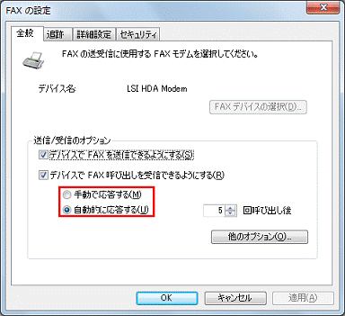 「手動で応答する」をクリックします。 - FAX受信時に自動的に応答したい場合 (標準の設定)