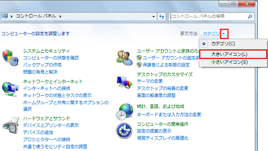 手順2.で表示方法を変更した場合は、「表示方法」の右側にある「▼」をクリックし、表示されるメニューから「カテゴリ」をクリックします。