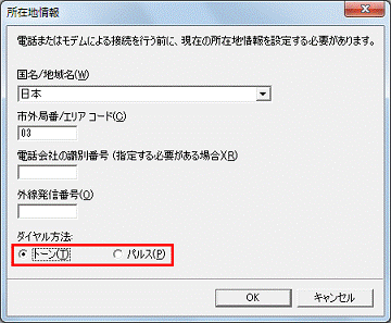 外線発信番号の指定がない場合は、空欄にします。 - 「ダイヤル方法」欄で、お使いの電話回線の種別を指定します。