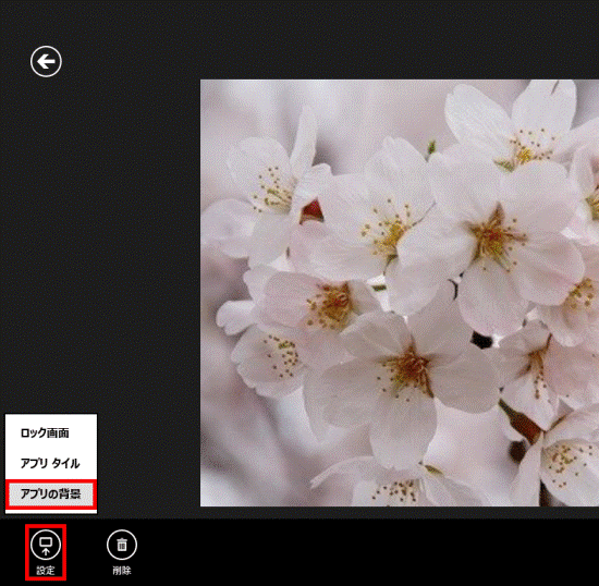- ここでは「アプリの背景」に設定します。背景に設定したい写真を表示してからアプリバーを表示し、「設定」をクリックまたはタップして「アプリの背景」を選択します。