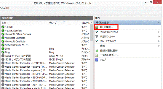 - 画面右側の「受信の規則」の項目から「新しい規則」をクリックします。