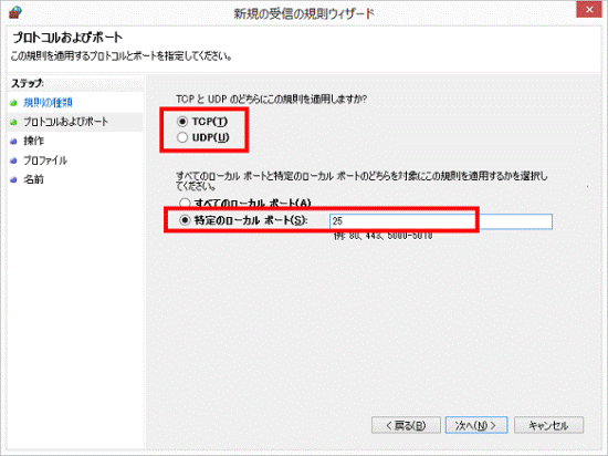 ポート番号にあわせて、TCPまたはUDPのいずれかをクリックします。 - ポートの指定