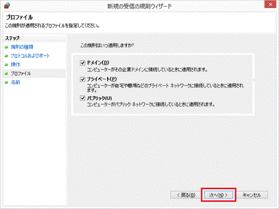 ポートを閉じるときは、「接続をブロックする」をクリックします。 - 「次へ」ボタンをクリックします。