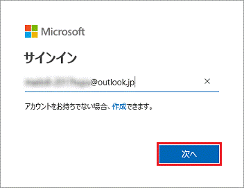 「Microsoft アカウントでサインイン」ボタンをクリックします。