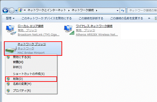 [Windows 7] 「ネットワーク接続」に、作成したおぼえがない「ネットワークブリッジ」アイコンが表示されます。