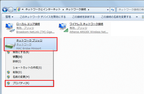 - 「ネットワーク ブリッジ」アイコンを右クリックし、表示されるメニューから「プロパティ」をクリックします。