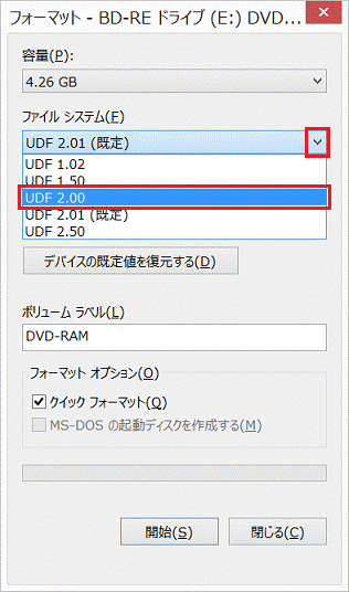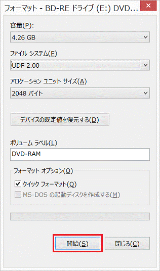 特定のDVD-RAMが読み込めないなど、ディスクに問題が生じている場合は、「クイックフォーマット」のチェックを外してフォーマットしてください。