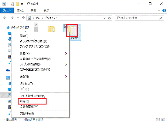 - 削除するファイル、または、フォルダーを右クリックし、表示されるメニューから「削除」をクリックします。