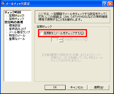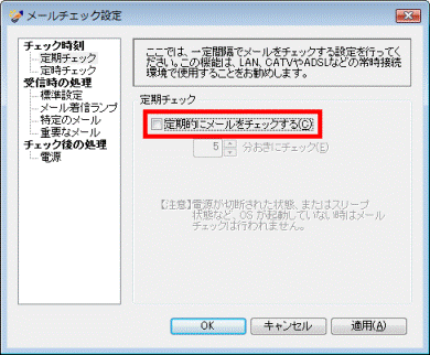 「メールチェック間隔」タブをクリックします。 - 「定期的にメールをチェックする」をクリックし、チェックを外します。
