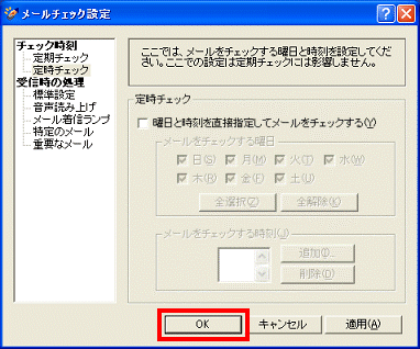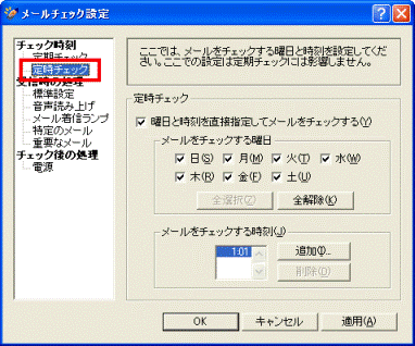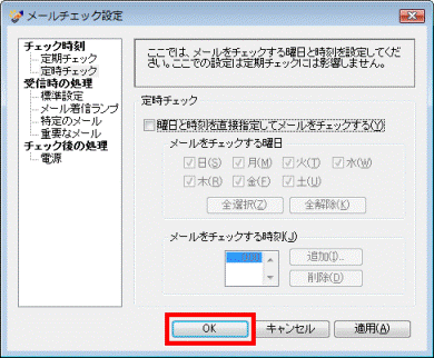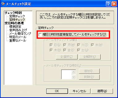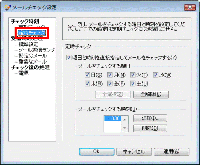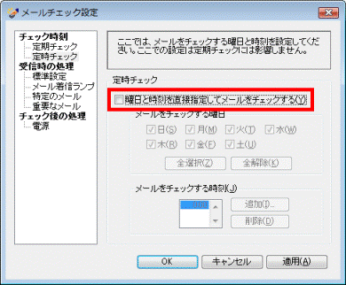 「曜日と時刻を指定し、メールをチェックする」をクリックし、チェックを外します。