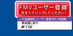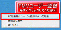 - デスクトップの「FMVユーザー登録」ボタンを右クリックし、表示されるメニューから、「PC起動時にユーザー登録ボタンを起動」をクリックし、チェックを外します。