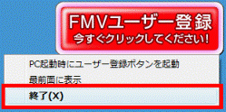 - もう一度「FMVユーザー登録」ボタンを右クリックし、表示されるメニューから「終了」をクリックします。