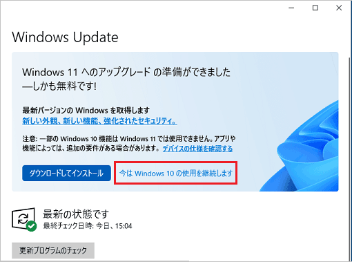 Windows Updateで表示された更新プログラムは、すべて適用してください。 - 「Windows 11へのアップグレードの準備ができました」と表示された場合は、「今はWindows 10の使用を継続します」をクリックしてください。