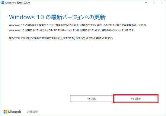 「はい」ボタンをクリックします。 - 「Windows 10 の最新バージョンへの更新」と表示されます。
