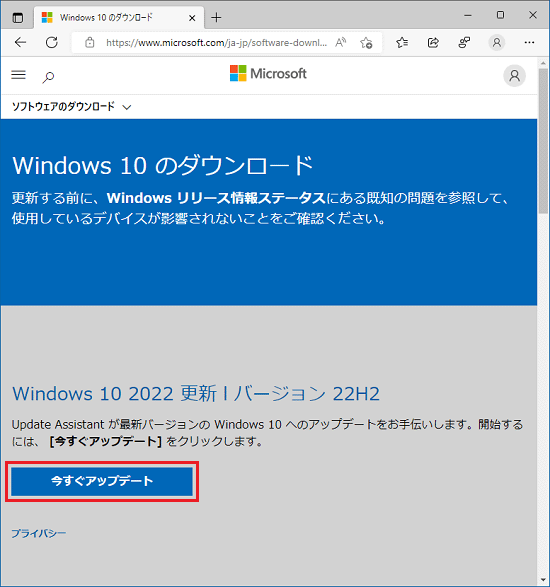Windows Updateで機能更新プログラムが配信されず、すぐに適用する必要がある場合は、マイクロソフト社のホームページから手動でアップデートできます。
