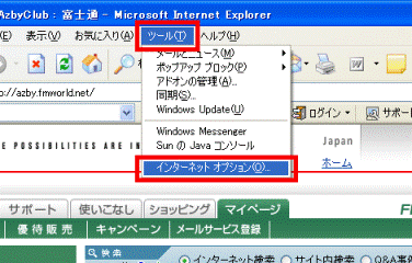 - 「ツール」メニュー→「インターネットオプション」の順にクリックします。