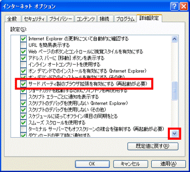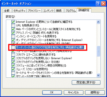 「サードパーティ製のブラウザ拡張を有効にする」のチェックを外した状態でエラーが発生しないときは、Internet Explorerに追加されたツールバーやプラグインなどの拡張機能が影響している可能性があります。