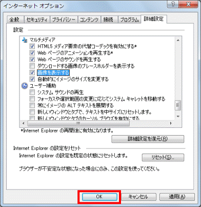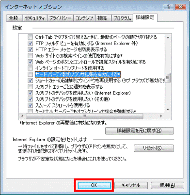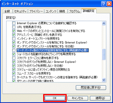 拡張機能が無効になるため、一部のツールバーが表示されなかったり、一部のファイルがInternet Explorerで開けなくなったりすることがあります。 - 「OK」ボタンをクリックし、「インターネットオプション」を閉じます。