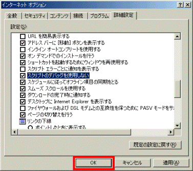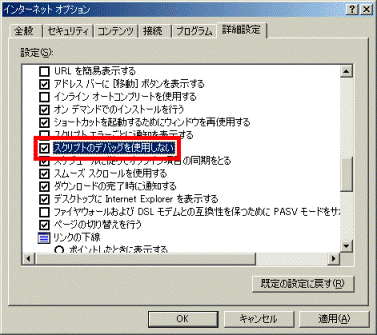 - 「スクリプトのデバッグを使用しない」をクリックし、チェックを付けます。