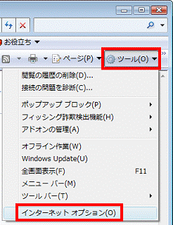 - 「ツール」メニュー →「インターネットオプション」の順にクリックします。